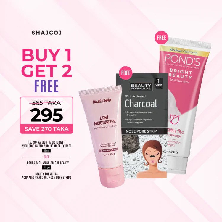 Buy Rajkonna Light Moisturizer With Rice Water And Licorice Extract and Get Ponds Face Wash Bright Beauty & Beauty Formulas Activated Charcoal Nose Pore Strips 1 Piece Free